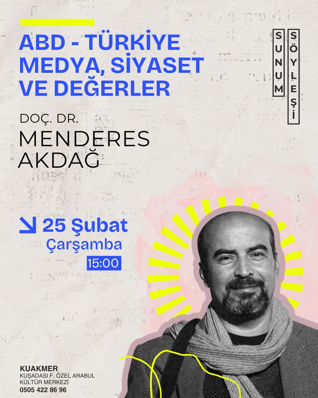 Doç Dr. Menderes Akdağ'ın, Amerika ve Türkiye ilişkilerini medya, siyaset ve değerler üzerinden anlatacağı söyleşisi, 25 Şubat Çarşamba 15.00'de. ÖzgeçmişAydın'da doğdu. Bu ilde ilk ve orta öğretimi tamamladı. 1998 yılında Dokuz Eylül Üniversitesi Buca Eğitim Fakültesi Tarih Öğretmenliği Bölümünden mezun oldu. Akdağ, Türkiye'deki çok partili siyasete geçiş konusundaki lisansüstü çalışmalarını […]