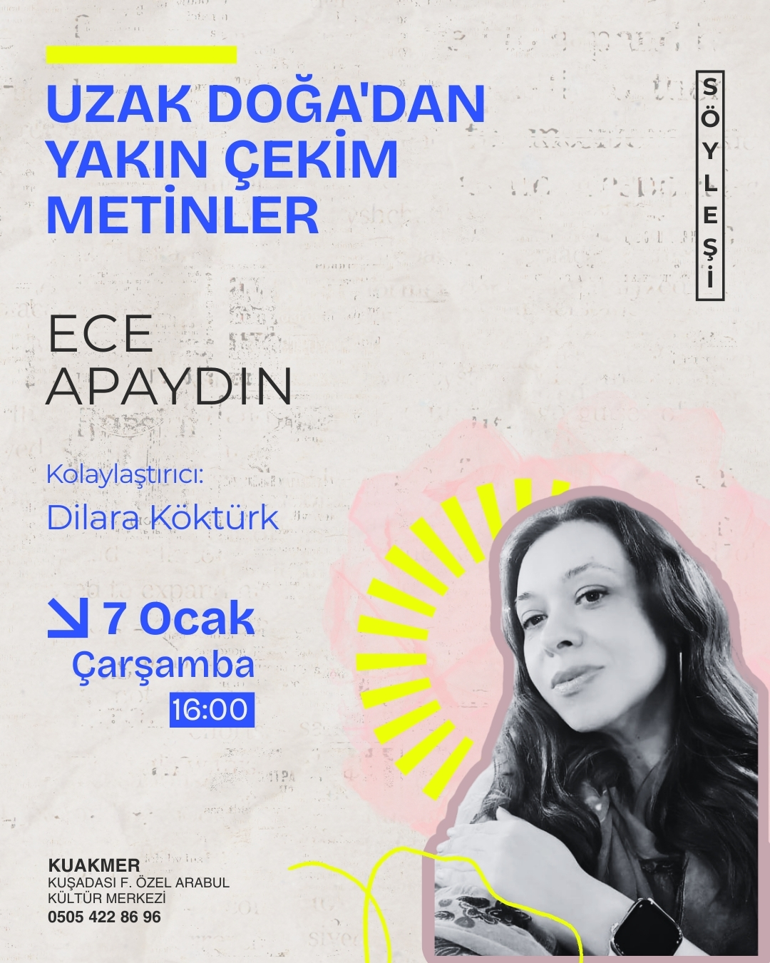 Şair Ece Apaydın, ilk romanı “Uzak Doğa’dan Yakın Çekim Metinler” ile 2026’nın ilk konuğu olacak.Roman, bir kadının yaşamı üzerinden doğayla yeniden kurulan bağları, geçmişin izlerini ve köklere dair soruları ele alıyor. Kolaylaştırıcı: Dilara Köktürk07 Ocak Çarşamba, 15.00’de Ece Apaydın1976 Manisa Doğumlu. 19 Yaşından bu yana şiir, deneme ve şiir üstüne […]