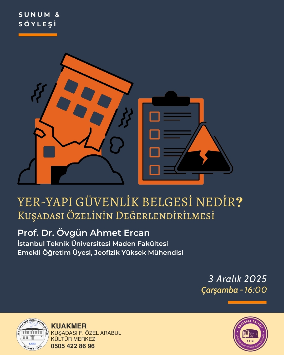 Kuşadası Caferli Güzelleştirme ve Dayanışma Derneği ile birlikte düzenlediğimiz ” Yer – Yapı Güvenliği Belgesi Nedir? Kuşadası Özelinin Değerlendirilmesi” başlıklı söyleşide, Prof. Dr. Övgün Ahmet Ercan’ı konuk edeceğiz. 03 Aralık Çarşamba 16.00’da bekleriz. Özgeçmiş1947 yılında Aydın’ın Nazilli ilçesinde doğdu. Yüksek öğrenimini 1970’te İstanbul Üniversitesi Jeofizik-Jeoloji bölümünde tamamladı. 1970’te ABD’ye gitti; […]