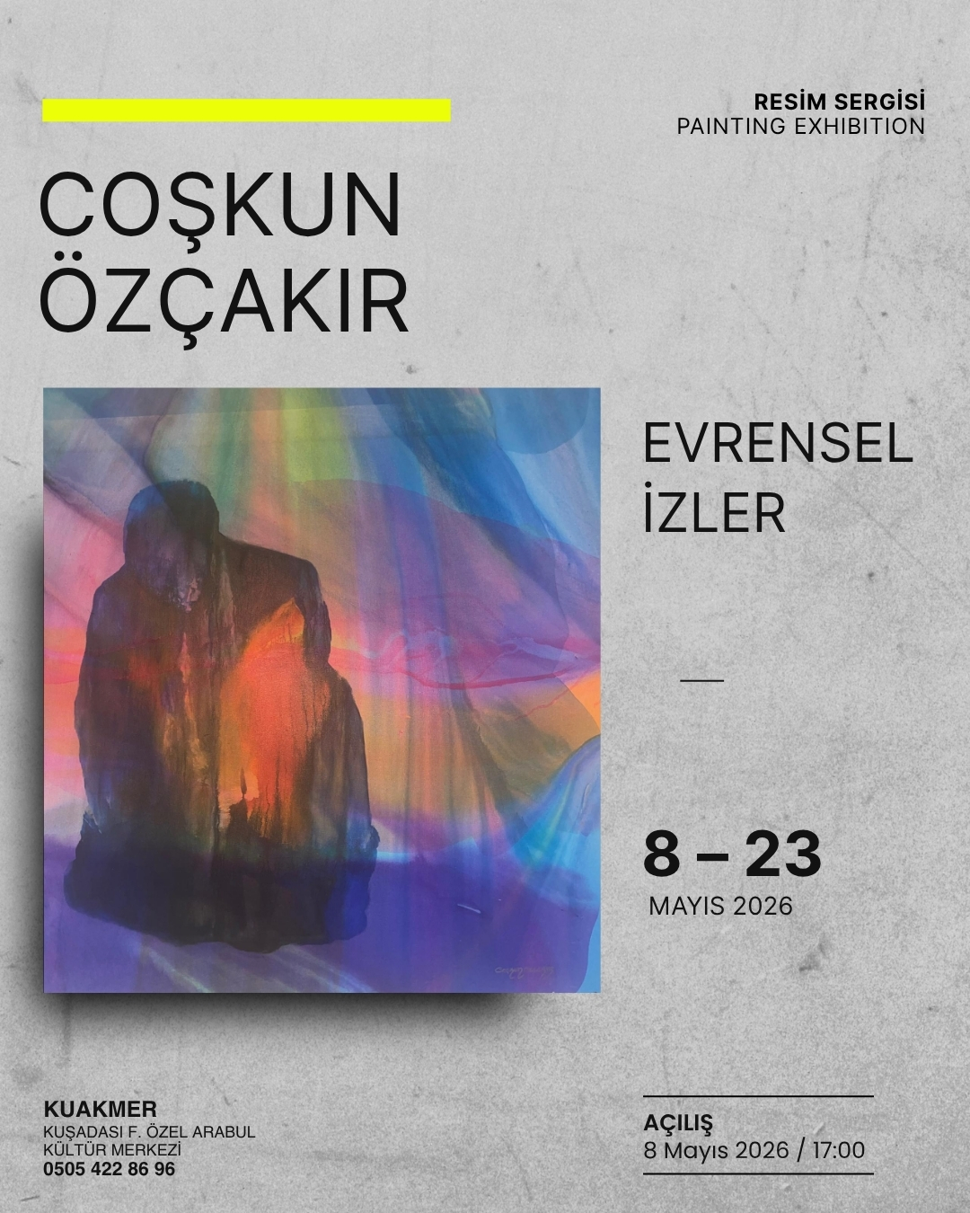 Coşkun Özçakır’ın “Evrensel İzler” resim sergisi KUAKMER Galeri’de açılıyor. Açılış: 08 Mayıs Cuma, 17.00’de Sergi 08 – 23 Mayıs tarihleri arasında gezilebilir. EVRENSEL İZLERHer şey iz bırakır. Görünmeyen, ama hissedilen bir akışın içinde ilerleriz.“Evrensel İzler”, bu akışın peşinden gider. Zamanın, doğanın ve insanın içinden geçen ortak bir ritmi dinler. Su, […]
